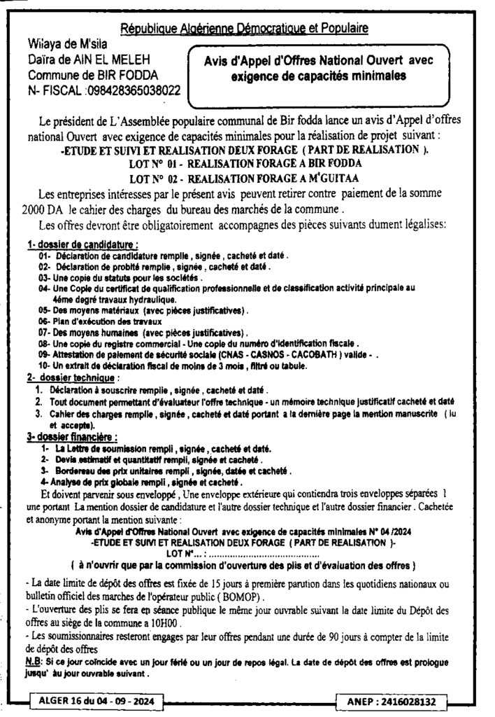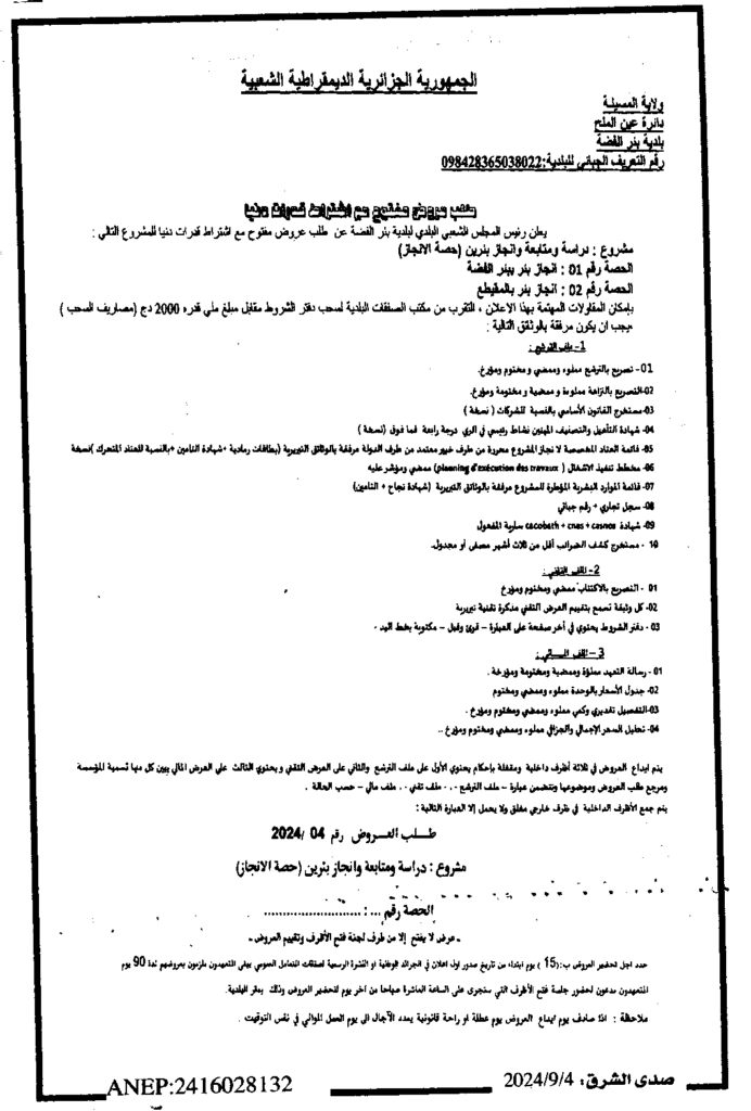إعلان عن طلب عروض مفتوح دراسة ومتابعة وانجاز بئرين (حصة الانجاز)/ بلدية بئر الفضة