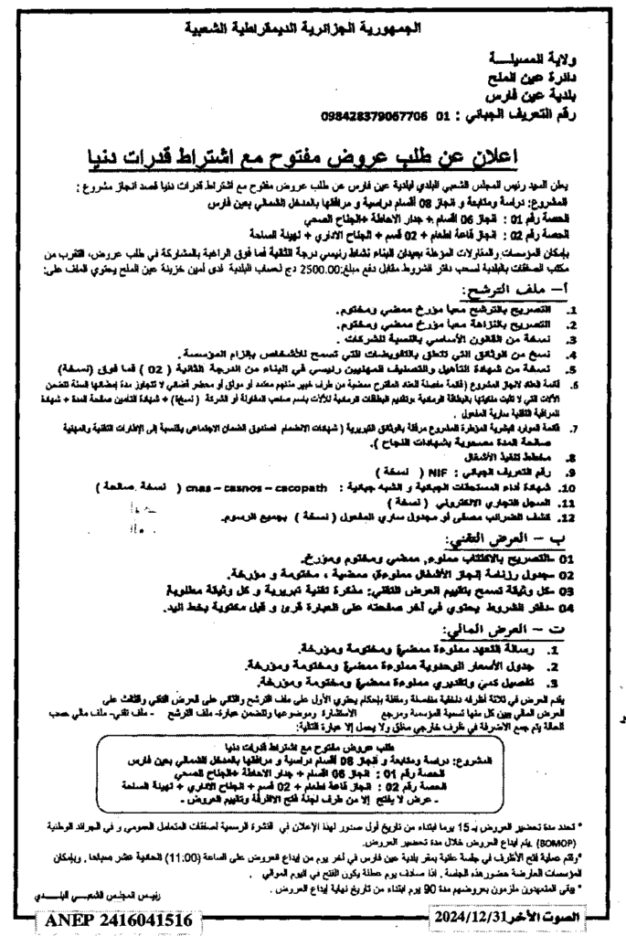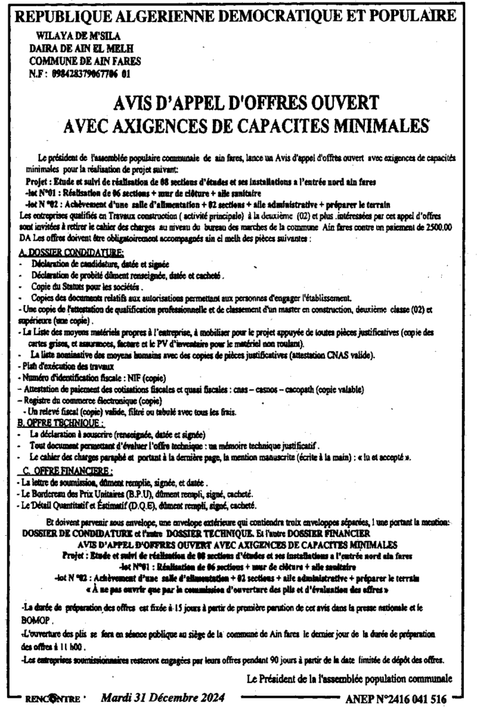 إعلان عن طلب عروض مفتوح دراسة ومتابعة وانجاز 8 أقسام دراسية ومرافقيها بالمدخل الشمالي بعين فارس/ مديرية التجهيزات العمومية بولاية المسيلة