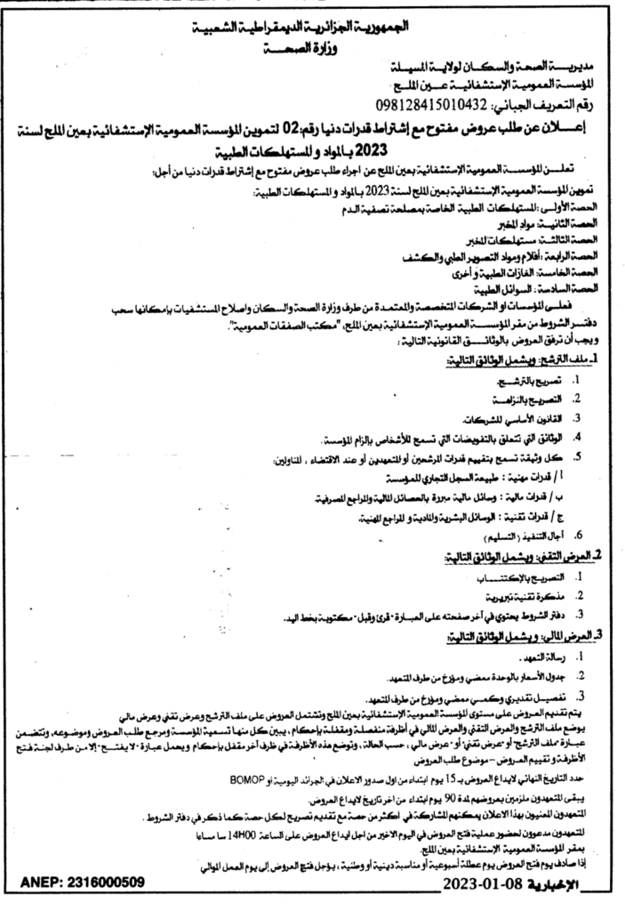 الحصة الأولى: المستهلكات الطبية الخاصة بمصلحة تصفية الدمالحصة الثانية: مواد المخبرالحصة الثالثة: مستهلكات المخبرالحصة الرابعة: لأقلام ومواد التصوير الطبي والكشفالحصة الخامسة: الغازات الطبية وأخرىالحصة السادسة: السوائل الطبية8 يناير، 20230 7 شاركها فيسبوك X مشاركة عبر البريد طباعة