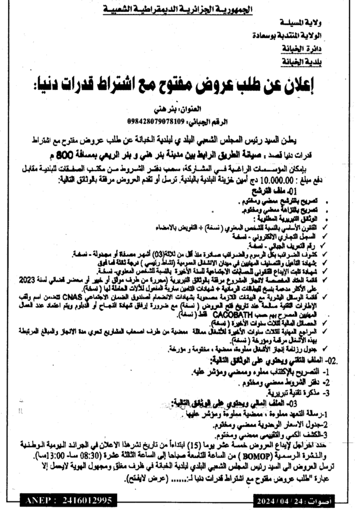 إعلان عن طلب عروض مفتوح صيانة الطريق الرابط بين مدينة بئر هني وبئر الريعي بمسافة 800م بلدية الخبانة