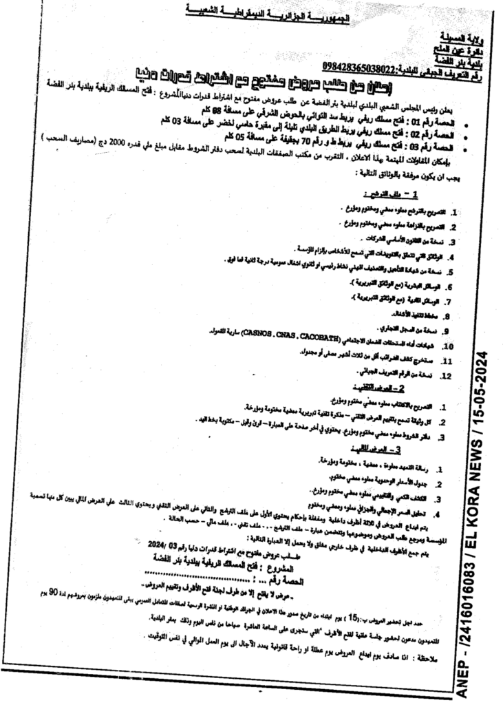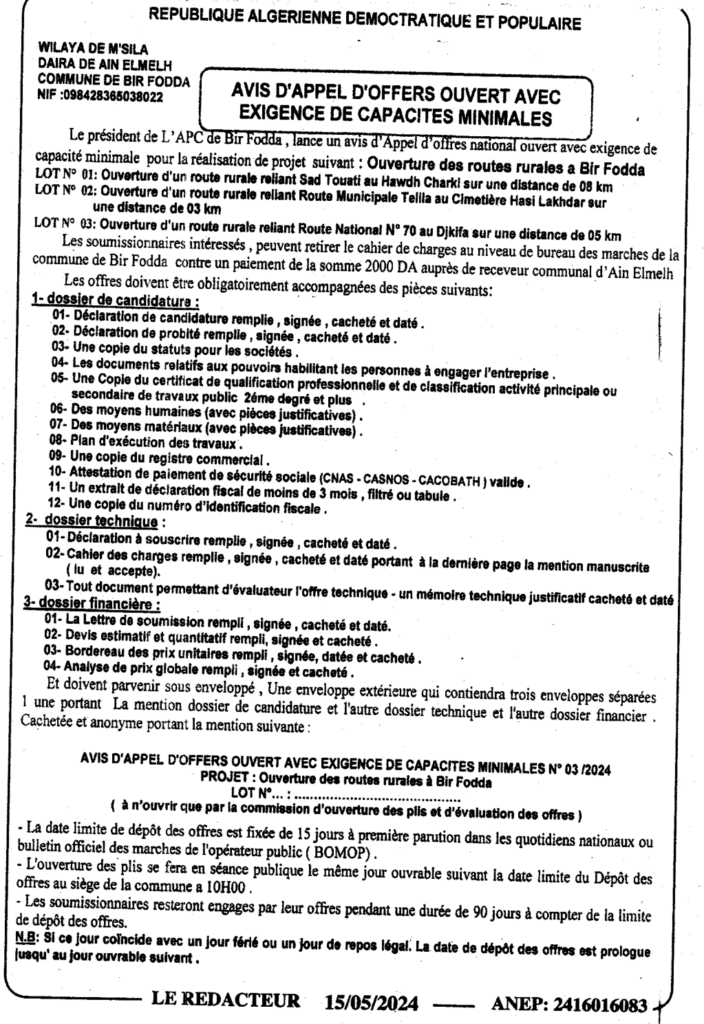 إعلان عن طلب عروض مفتوح فتح المسالك الريفية ببلدية بئر الفضة