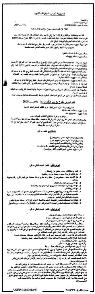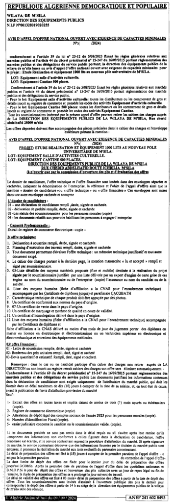 إعلان عن طلب عروض مفتوح لدراسة وانجاز وتجهيز 1000 سرير بالقطب الجامعي الجديد بالمسيلة/ مديرية التجهيزات العمومية لولاية المسيلة