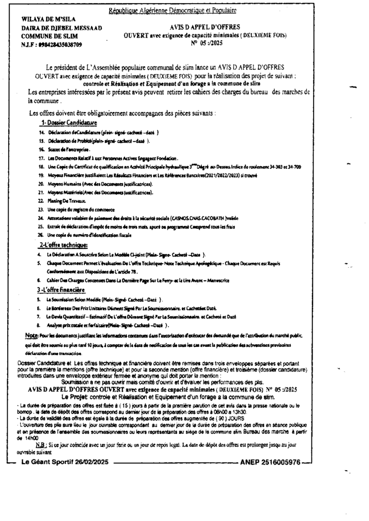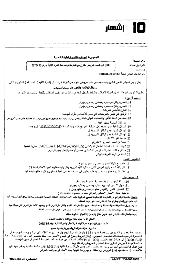 إعلان عن طلب عروض مفتوح (للمرة الثانية) 2025/05 بلدية سليم