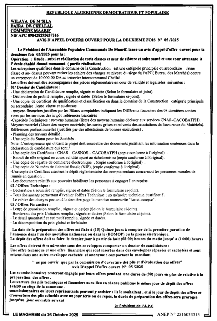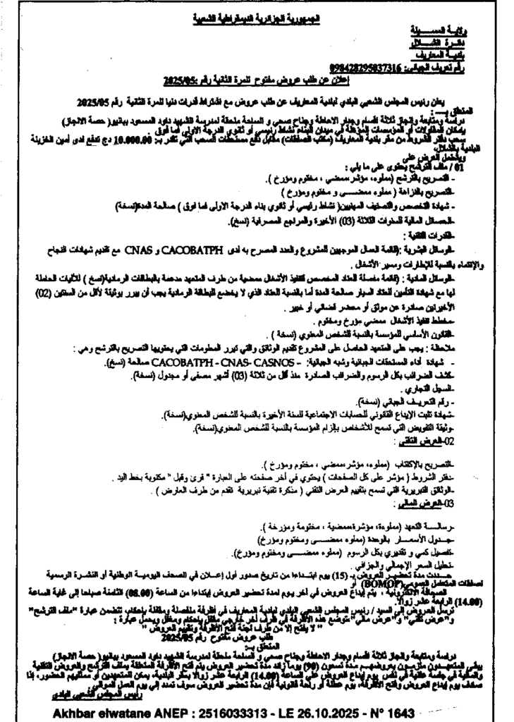 إعلان عن طلب عروض مفتوح للمرة الثانية 2025/05 بلدية المعاريف