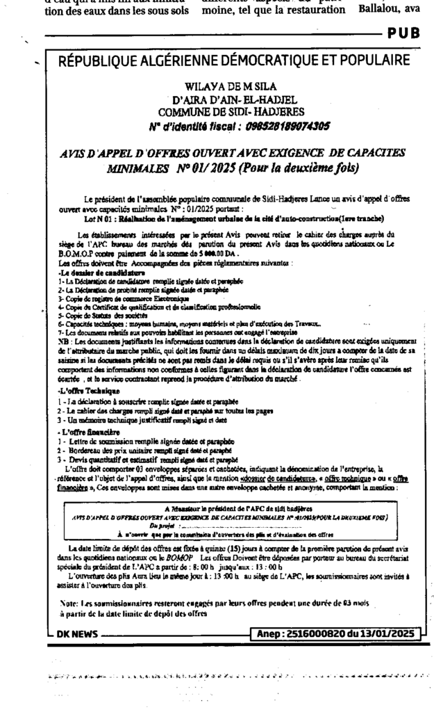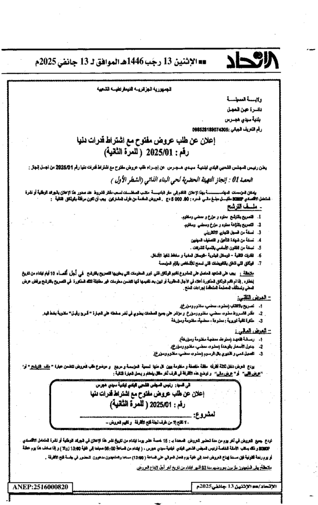 إعلان عن طلب عروض مفتوح (للمرة الثانية) 2025/01 بلدية سيدي هجرس