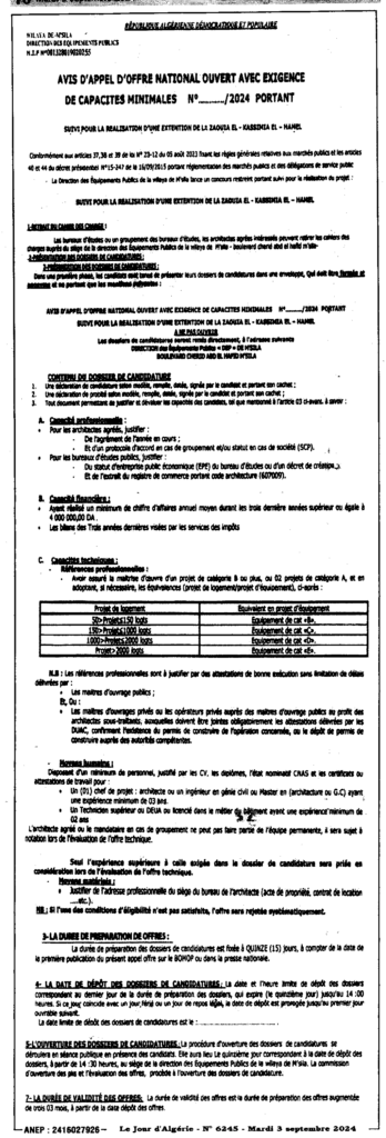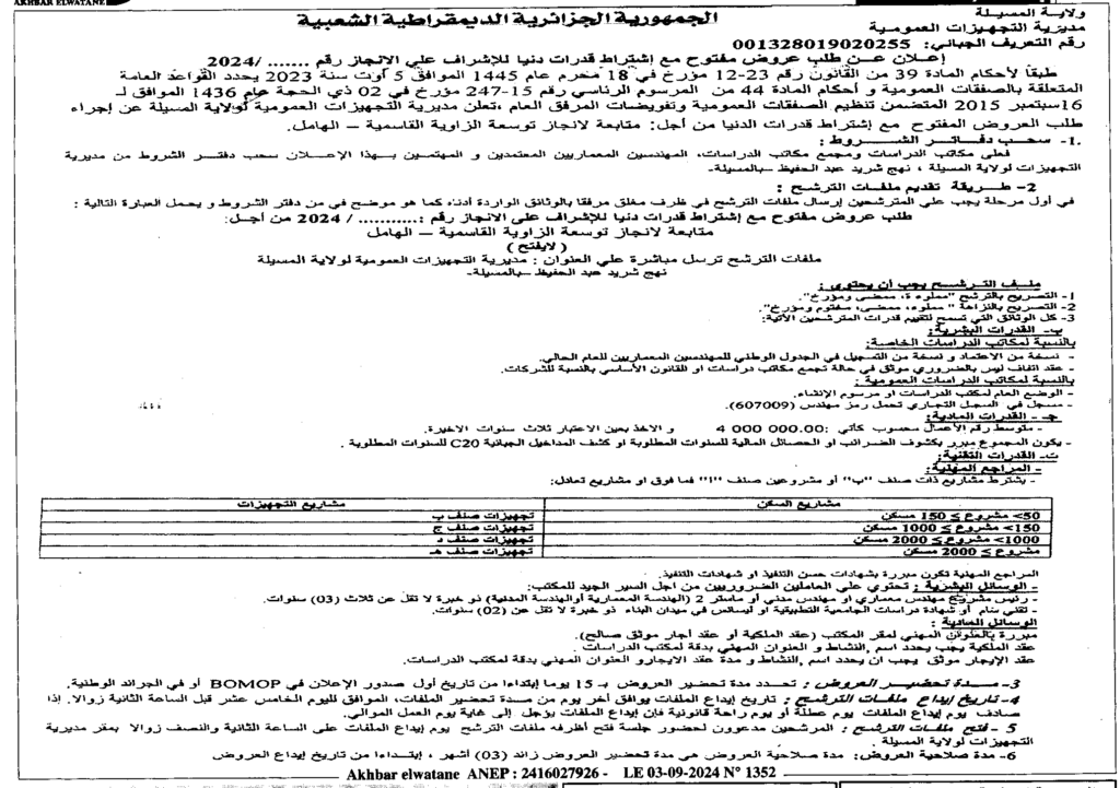 إعلان عن طلب عروض مفتوح متابعة لانجاز توسعة الزاوية القاسمية الهامل/ مديرية التجهيزات العمومية بالمسيلة