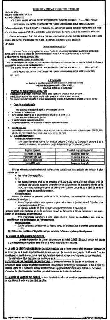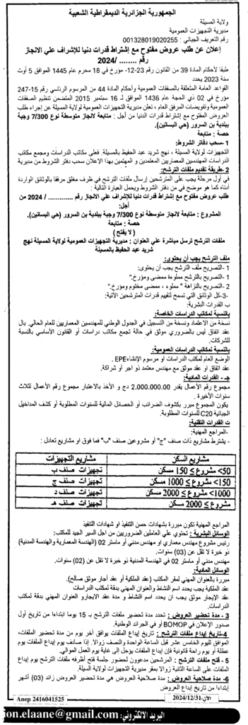 إعلان عن طلب عروض مفتوح متابعة لانجاز متوسطة نوع 7/300 وجية ببلدية بن سرور/ مديرية التجهيزات العمومية بولاية المسيلة