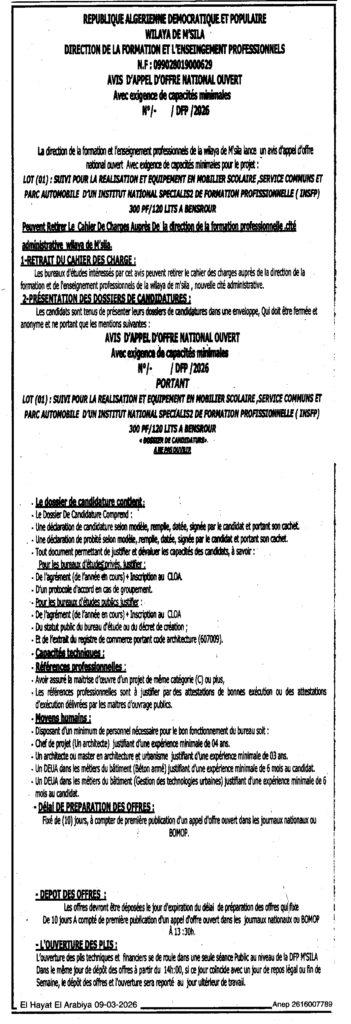 إعلان عن طلب عروض مفتوح متابعة وانجاز وتجهيز الاثاث المدرسي لمصالح المشتركة وحظيرة السيارات/ مديرية التكوين والتعليم المهنيين لولاية المسيلة