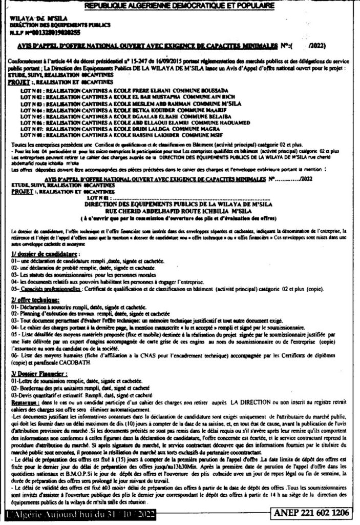 طلب عروض مفتوح مع اشتراط قدرات دنيا من أجل تسمية العملية: إنجاز 08 مطاعم مدرسية31 أكتوبر، 20220 16 شاركها فيسبوك X مشاركة عبر البريد طباعة