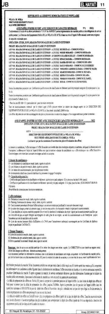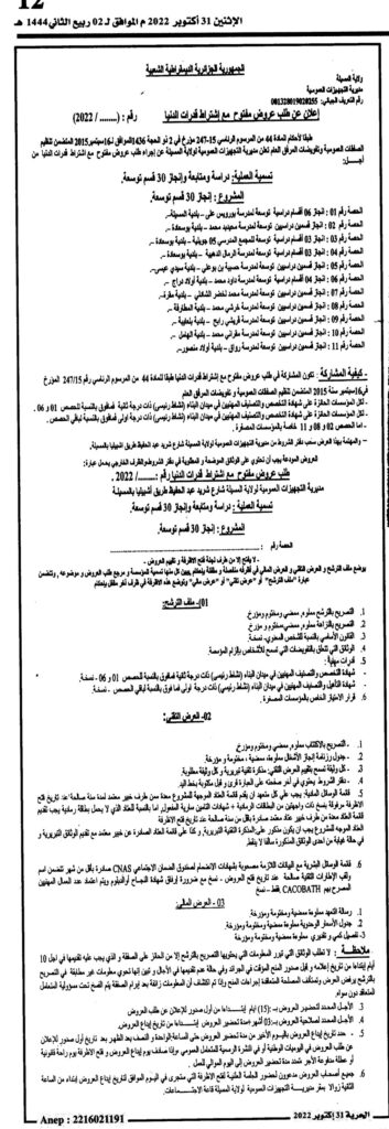 طلب عروض مفتوح مع اشتراط قدرات دنيا من أجل تسمية العملية: دراسة ومتابعة وإنجاز 30 قسم توسعة31 أكتوبر، 20220 9 شاركها فيسبوك X مشاركة عبر البريد طباعة