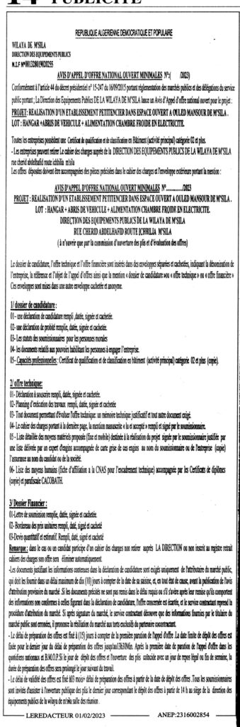 إعلان عن طلب عروض مفتوح/ مديرية التجهيزات العمومية لولاية المسيلة