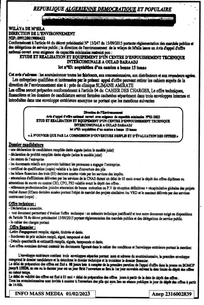 إعلان عن طلب عروض مفتوح/ مديرية التجهيزات العمومية لولاية المسيلة