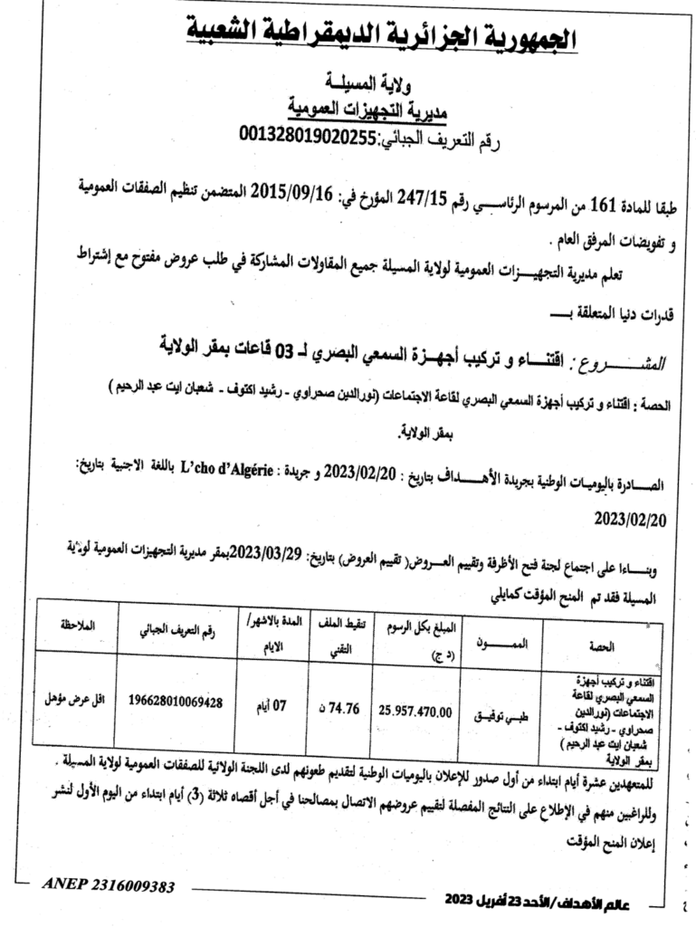 إعلان عن طلب عروض مفتوح/ مديرية التجهيزات العمومية لولاية المسيلة