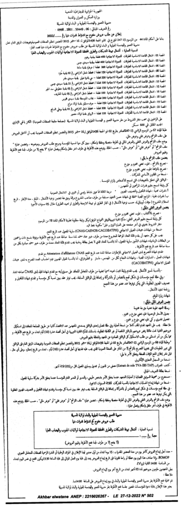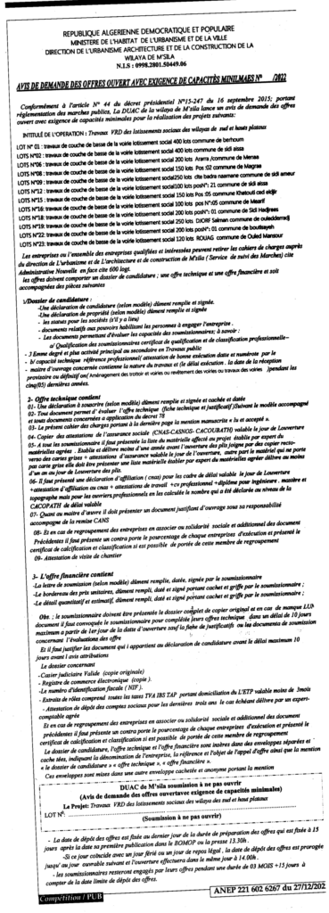 تسمية العملية: أشغال تهيئة الشبكات والطرق المختلفة للتجزئة الاجتماعية لولايات الجنوب والهضاب العليا28 ديسمبر، 20220 21 شاركها فيسبوك X مشاركة عبر البريد طباعة
