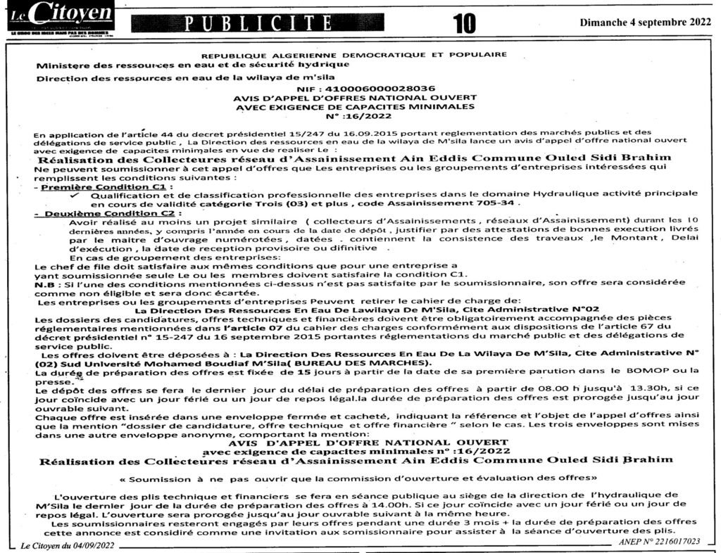طلب عروض وطني مفتوح مع اشتراط قدرات دنيا قصد: انجاز مجمعات شبكة التطهير بعين الديس بلدية أولاد سيدي ابراهيم4 سبتمبر، 20220 16 شاركها فيسبوك X مشاركة عبر البريد طباعة