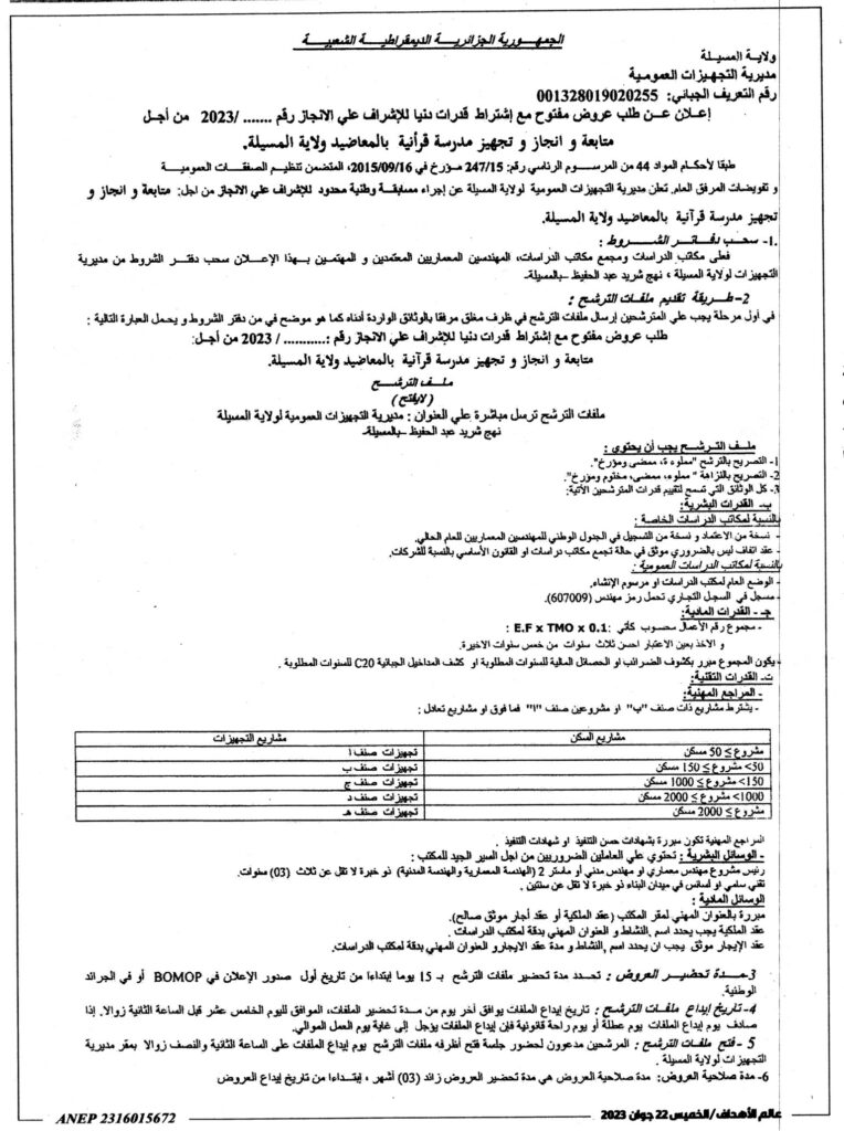 إعلان عن طلب عروض مفتوح من أجل متابعة وانجاز وتجهيز مدرسة قرآنية بالمعاضيد ولايةالمسيلة/ مديرية التجهيزات العمومية