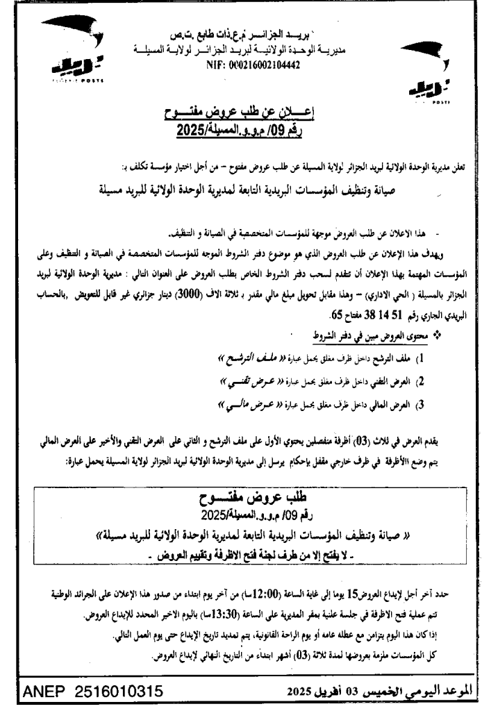 إعلان عن طلب عروض مفتوح 09/م.و.و.المسيلة/2025 مديرية الوحدة الولائية لبريد الجزائر لولاية المسيلة