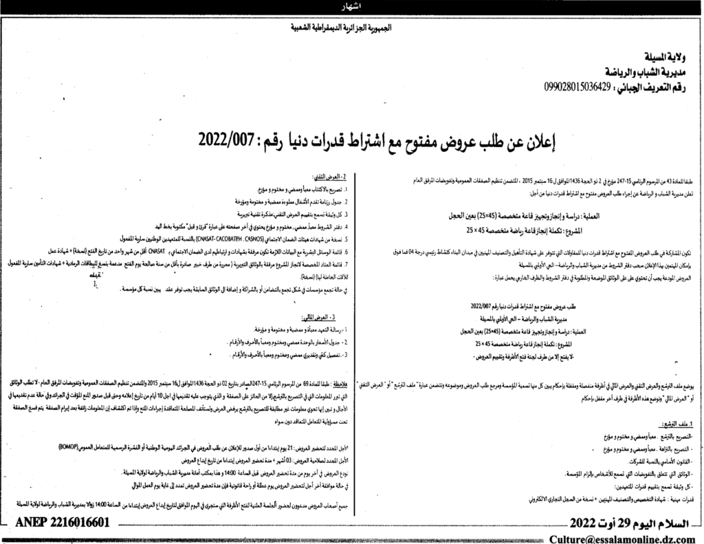 إعلان عن طلب عروض مفتوح 2022/007 مديرية الشباب والرياضة