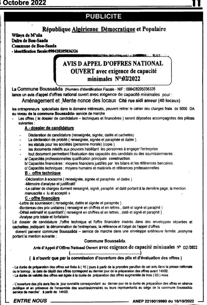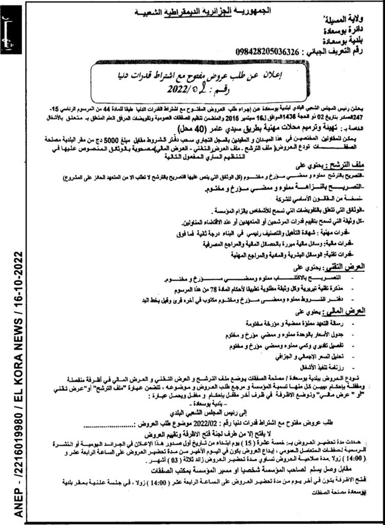 طلب عروض مفتوح مع اشتراط قدرات دنيا المتعلق بـالأشغال الخاصة بـ : تهيئة وترميم محلات مهنية بطريق سيدي عامر (40 محل)16 أكتوبر، 20220 36 شاركها فيسبوك X مشاركة عبر البريد طباعة