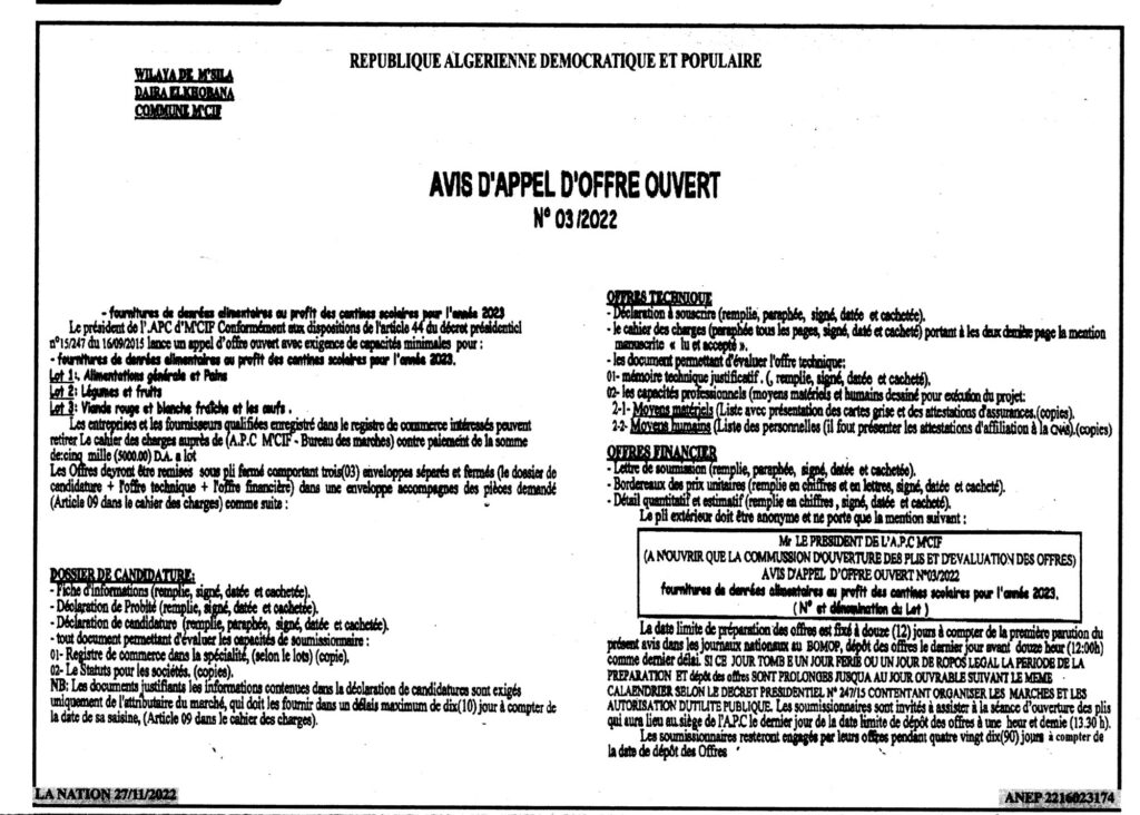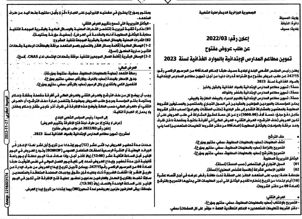 طلب عروض مفتوح مع إشتراط قدرات دنيا من أجل: تموين المطاعم المدارس الإبتدائيةبالمواد الغذائية لسنة 202327 نوفمبر، 20220 44 شاركها فيسبوك X مشاركة عبر البريد طباعة