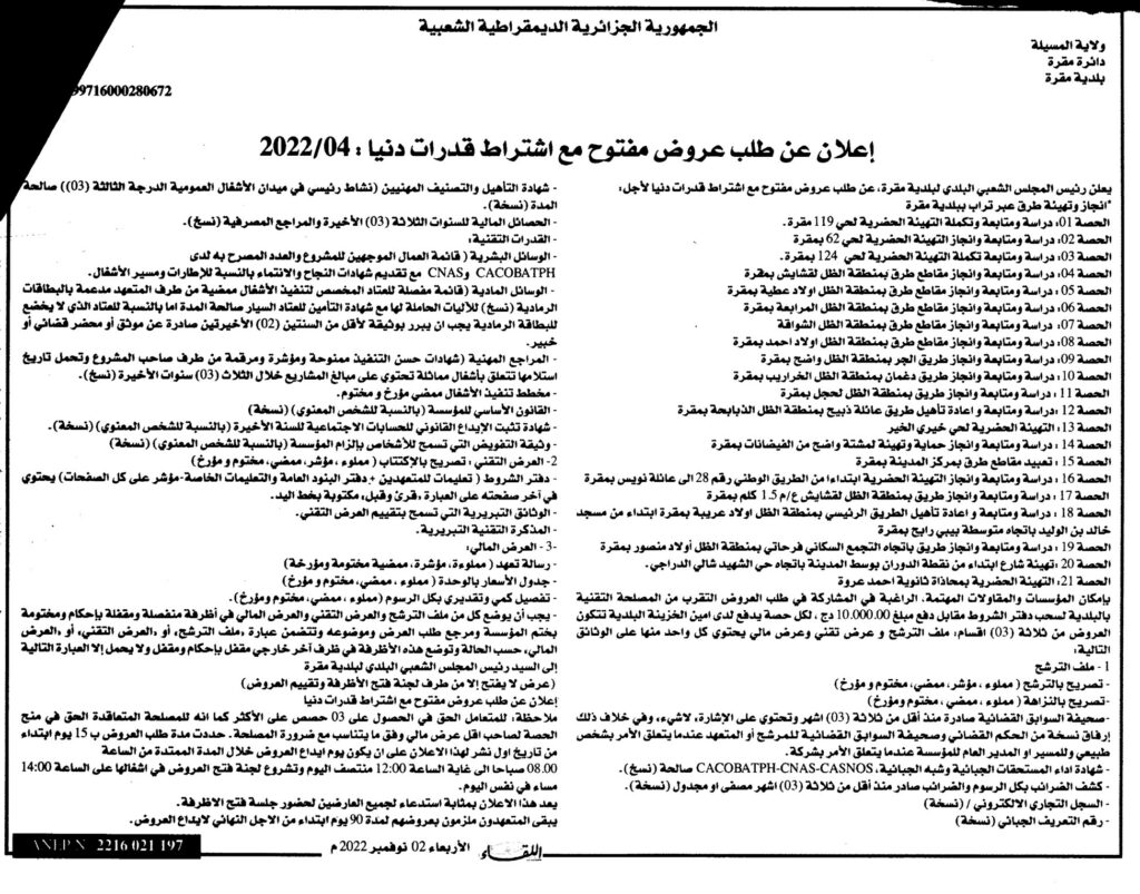 طلب عروض مفتوح مع اشتراط قدرات دنيا لأجل: إنجاز وتهيئة طرق عبر تراب بلدية مقرة (21 حصة)2 نوفمبر، 20220 16 شاركها فيسبوك X مشاركة عبر البريد طباعة
