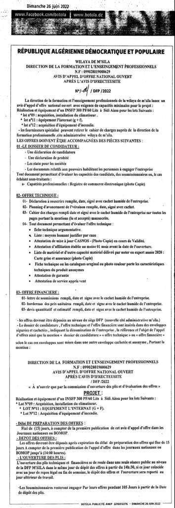 إعلان عن طلب عروض مفتوح 2022/04 مديرية التكوين والتعليم المهنيين