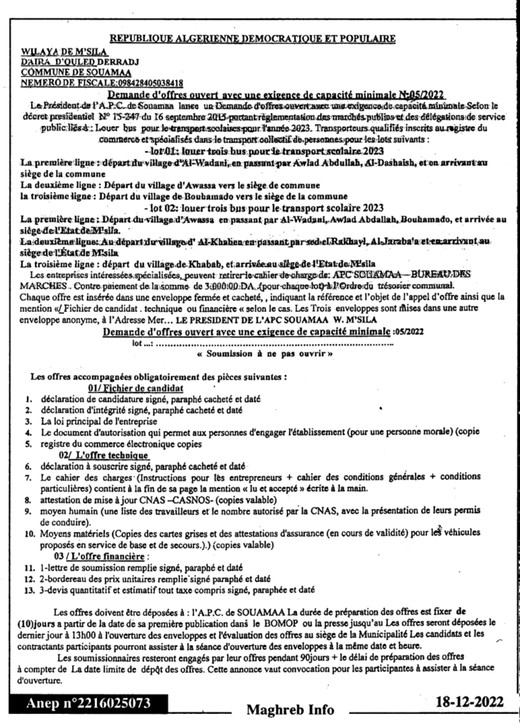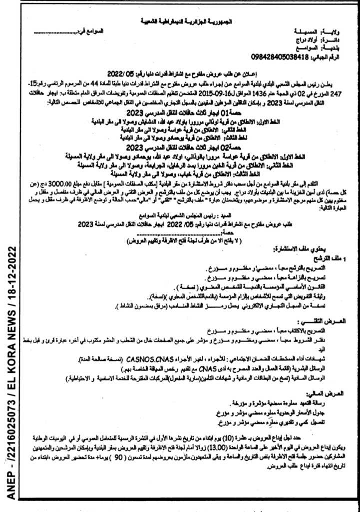 إعلان عن طلب عروض مفتوح 2022/05 بلدية السوامع