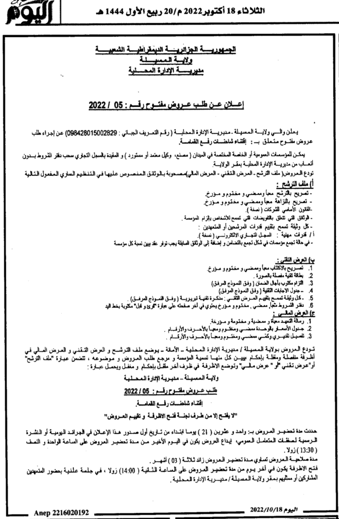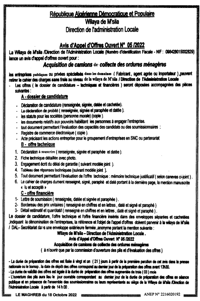 إجراء طلب عروض مفتوح متعلق بـ : إقتناء شاحنات رفع القمامة18 أكتوبر، 20220 10 شاركها فيسبوك X مشاركة عبر البريد طباعة