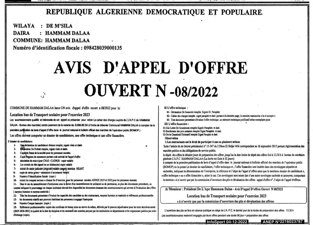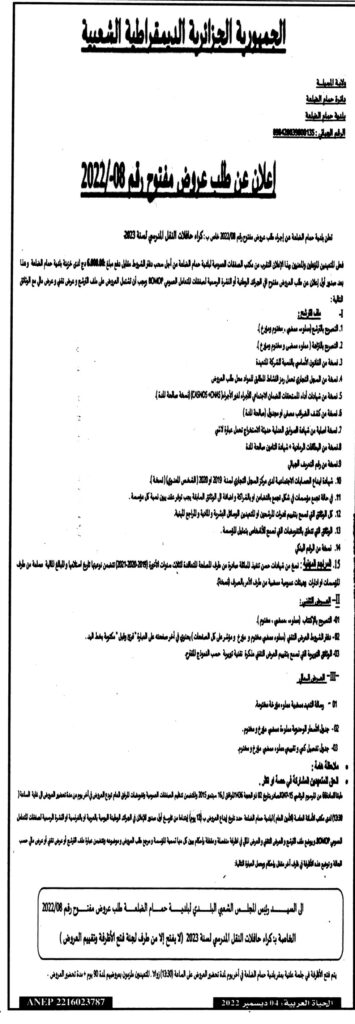 طلب عروض مفتوح مع اشتراط قدرات دنيا لـ: لكراء حافلات النقل المدرسي لسنة 20234 ديسمبر، 20220 5 شاركها فيسبوك X مشاركة عبر البريد طباعة