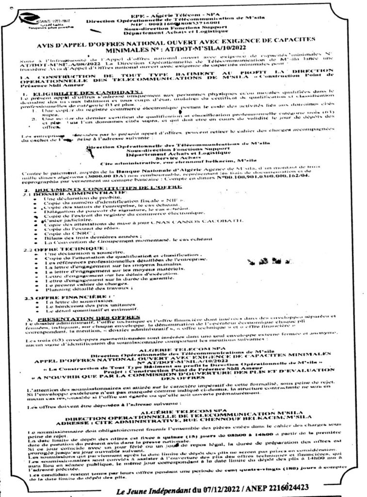 إعلان عن طلب عروض مفتوح 2022/10 الوحدة الولائية اتصالات الجزائرالمسيلة