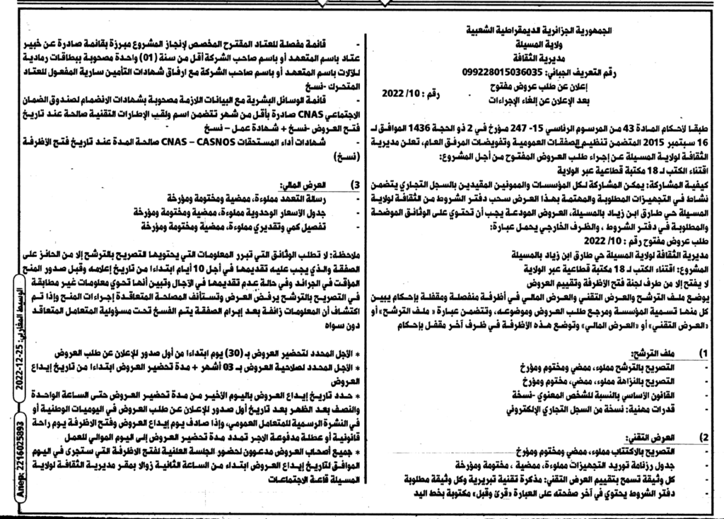 إعلان عن طلب عروض مفتوح 2022/10 بعد الاعلان عن إلغاء الإجراءات/ مديرية الثقافة لولاية المسيلة