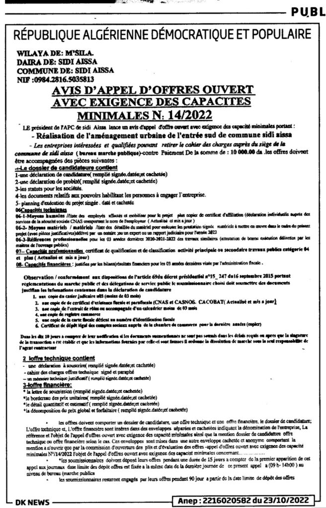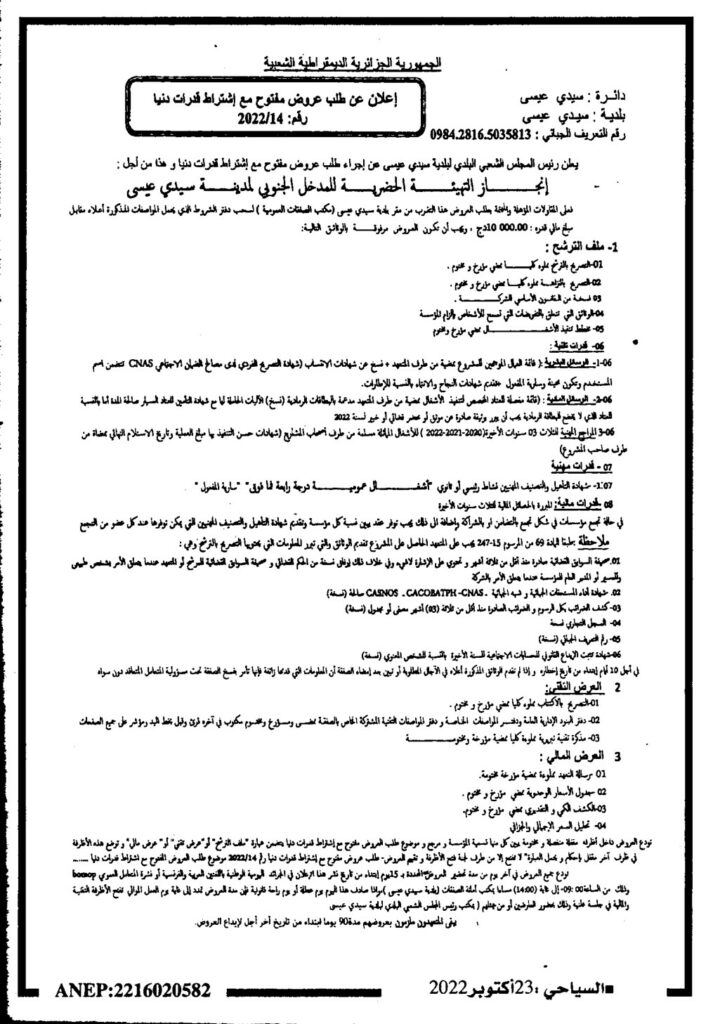 إجراء طلب عروض مفتوح مع اشتراط قدرات دنيا وهذا منأجل: إنجاز التهيئة الحضرية للمدخل الجنوبي لمدبنة سيدي عيسى23 أكتوبر، 20220 21 شاركها فيسبوك X مشاركة عبر البريد طباعة