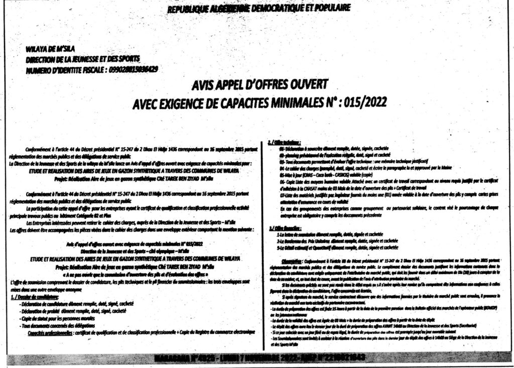 إعلان عن طلب عروض مفتوح 2022/15 مديرية الشباب والرياضة ولاية المسيلة