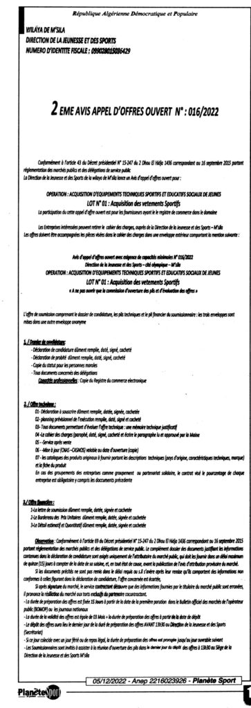 إعلان عن طلب عروض مفتوح 2022/16 مديرية الشباب والرياضة ولاية المسيلة