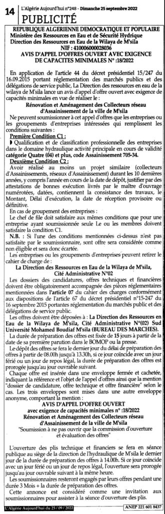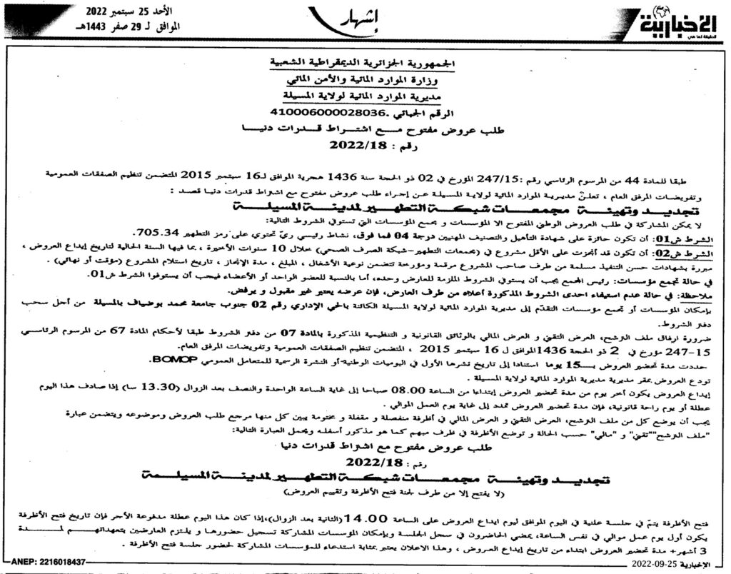 إجراء طلب عروض مفتوح مع اشتراط قدرات دنيا قصد: تجديد وتهيئة مجمعات شبكة التطهير لمدينة المسيلة25 سبتمبر، 20220 29 شاركها فيسبوك X مشاركة عبر البريد طباعة