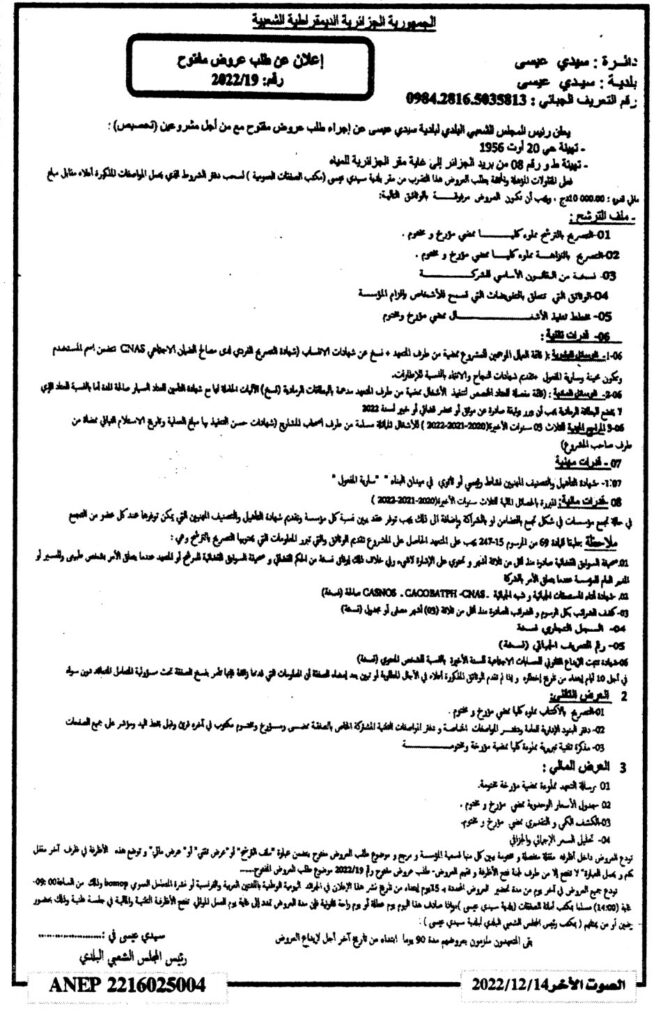 طلب عروض مفتوح من أجل مشروعين (تحصيص):تهيئة حي 20 أوت 1956تهيئة ط و رقم 08 من بريد الجزائر إلى غاية مقر الجزائرية للمياه14 ديسمبر، 20220 5 شاركها فيسبوك X مشاركة عبر البريد طباعة