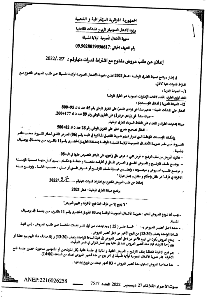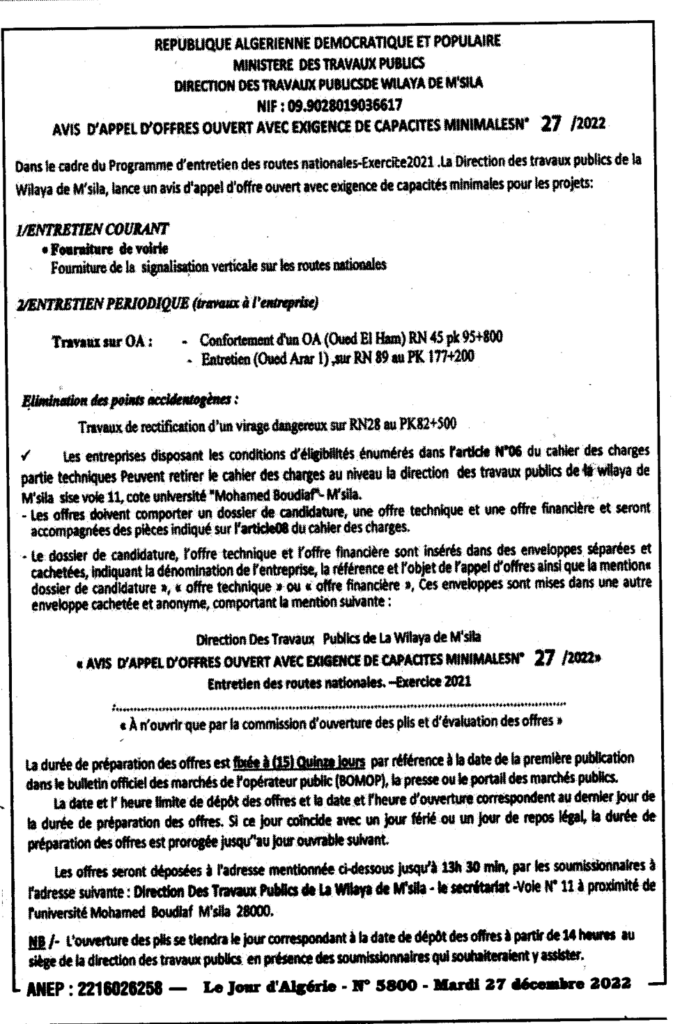 إعلان عن طلب عروض مفتوح 2022/27 مديرية الأشعال العمومية لولاية المسيلة