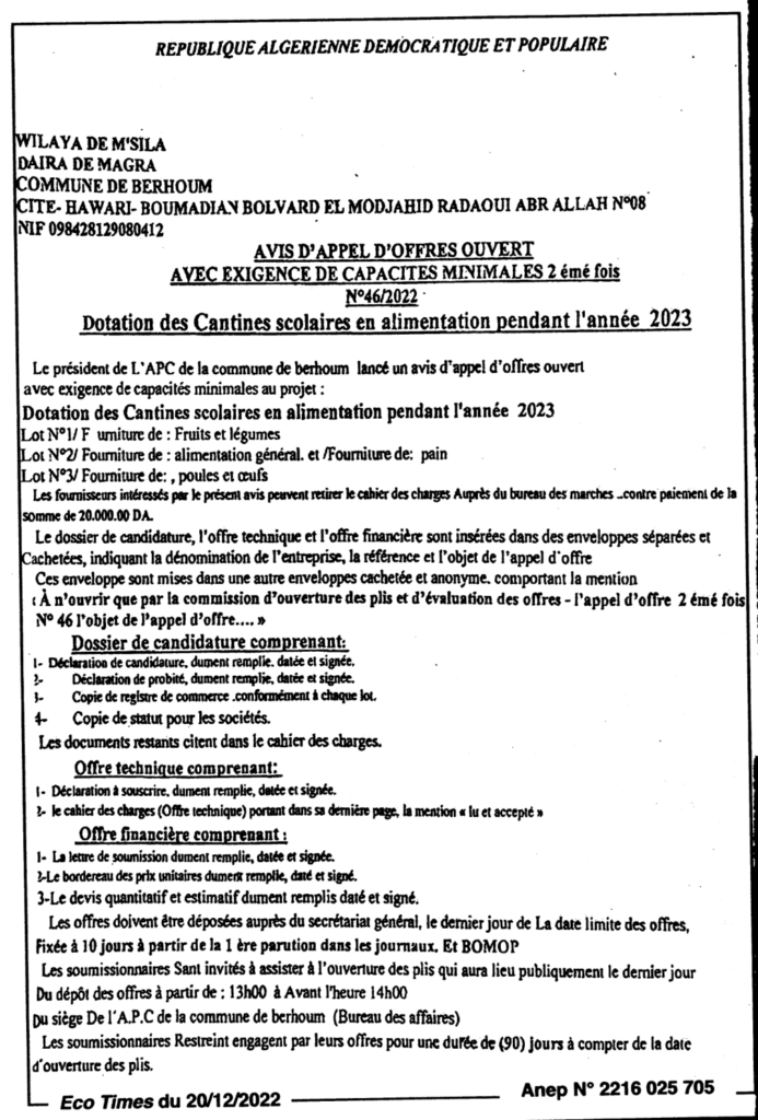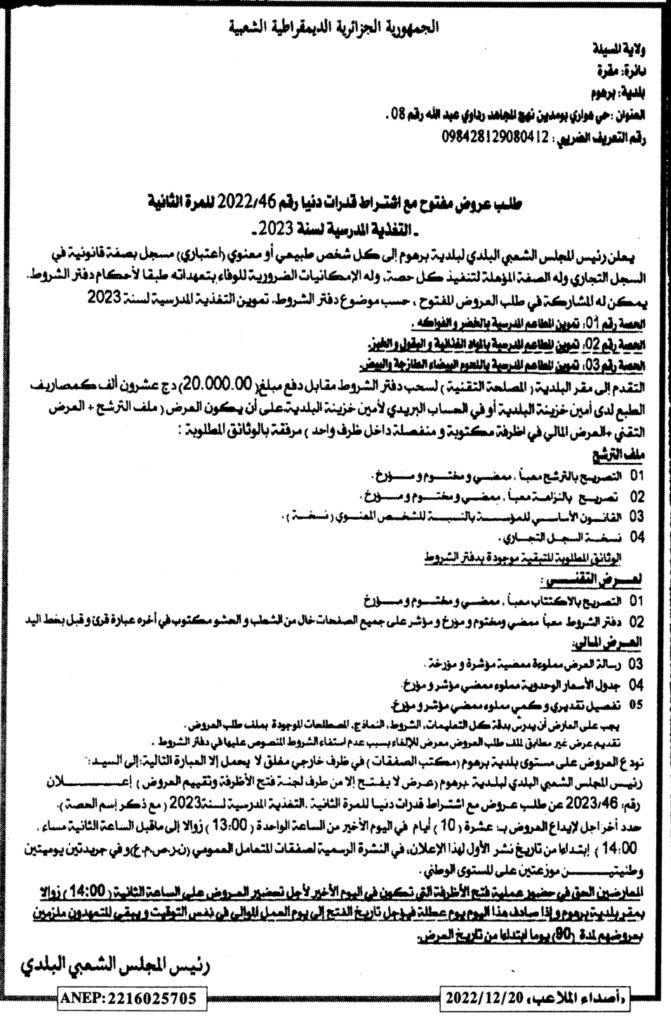 إعلان عن طلب عروض مفتوح 2022/46 للمرة الثانية -التغذية المدرسية لسنة 2023- بلدية برهوم