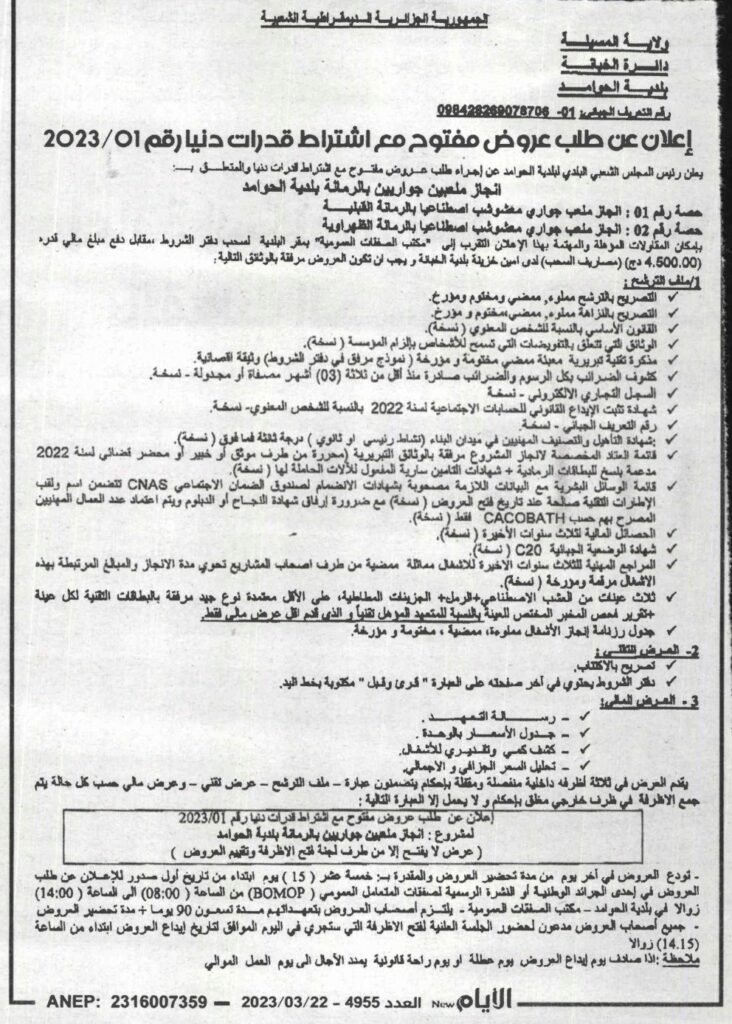 طلب عروض مفتوح مع اشتراط قدرات دنيا والمتعلق بـ : انجاز ملعبين جواريين بالرمانة بلدية الحوامد22 مارس، 20230 51 شاركها فيسبوك X مشاركة عبر البريد طباعة