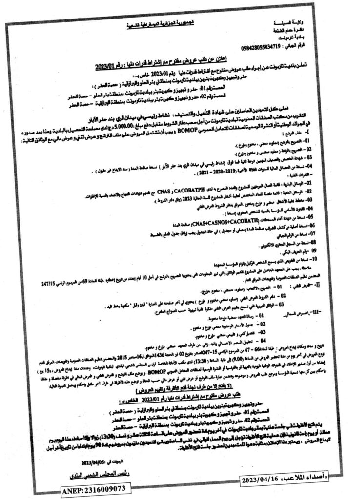طلب عروض مفتوح مع اشتراط قدرات دنيا خاص بـ : حفر وتجهيز وكهربة بئرين ببلدية تارمونت بمنطقتي بئر الحلو والبرازقية -حصة الحفر-16 أبريل، 20230 8 شاركها فيسبوك X مشاركة عبر البريد طباعة