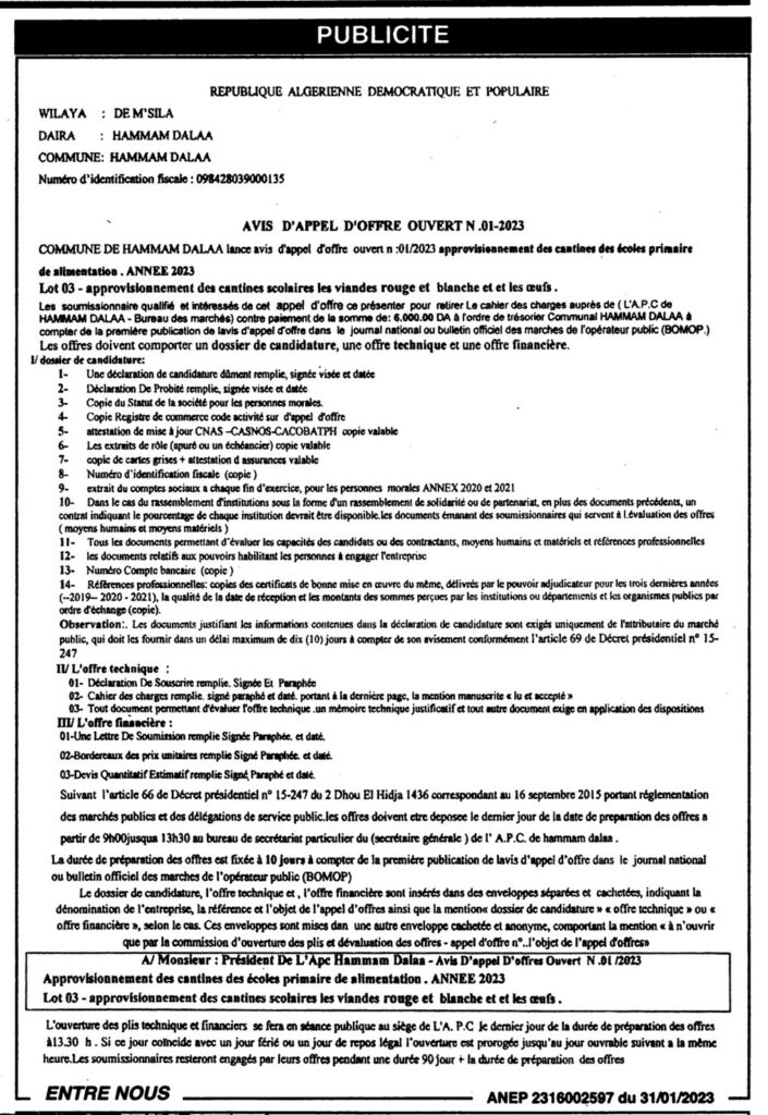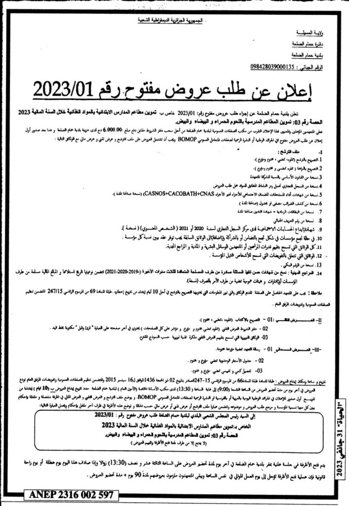 طلب عروض مفتوح خاص بـ تموين مطاعم المدارس الابتدائية خلال السنة المالية 202331 يناير، 20230 20 شاركها فيسبوك X مشاركة عبر البريد طباعة