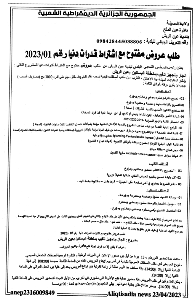 إعلان عن طلب عروض مفتوح 2023/01 بلدية عين الريش