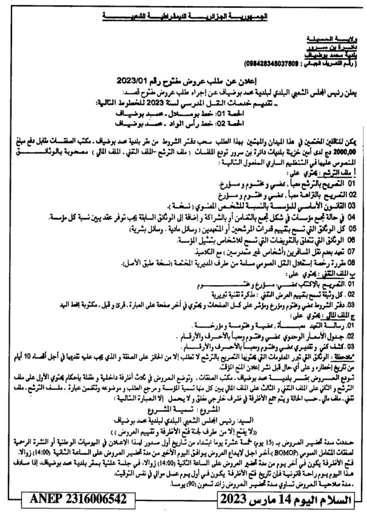 طلب عروض مفتوح قصد: تقديم خدمات النقل المدرسي لسنة 2023 للخطوطو التالية:الحصة 01: خط بوملال-محمد بوضيافالحصة 02: خط رأس الواد-محمد بوضياف14 مارس، 20230 21 شاركها فيسبوك X مشاركة عبر البريد طباعة