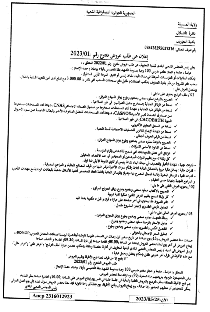 إعلان عن طلب عروض مفتوح 2023/01: دراسة متابعة وانجاز مطعم مدرسي 100 وجبة بمدرسة الشهيد بتقة الخميسي بأولاد بوعبان (حصة الانجاز) بلدية المعاريف