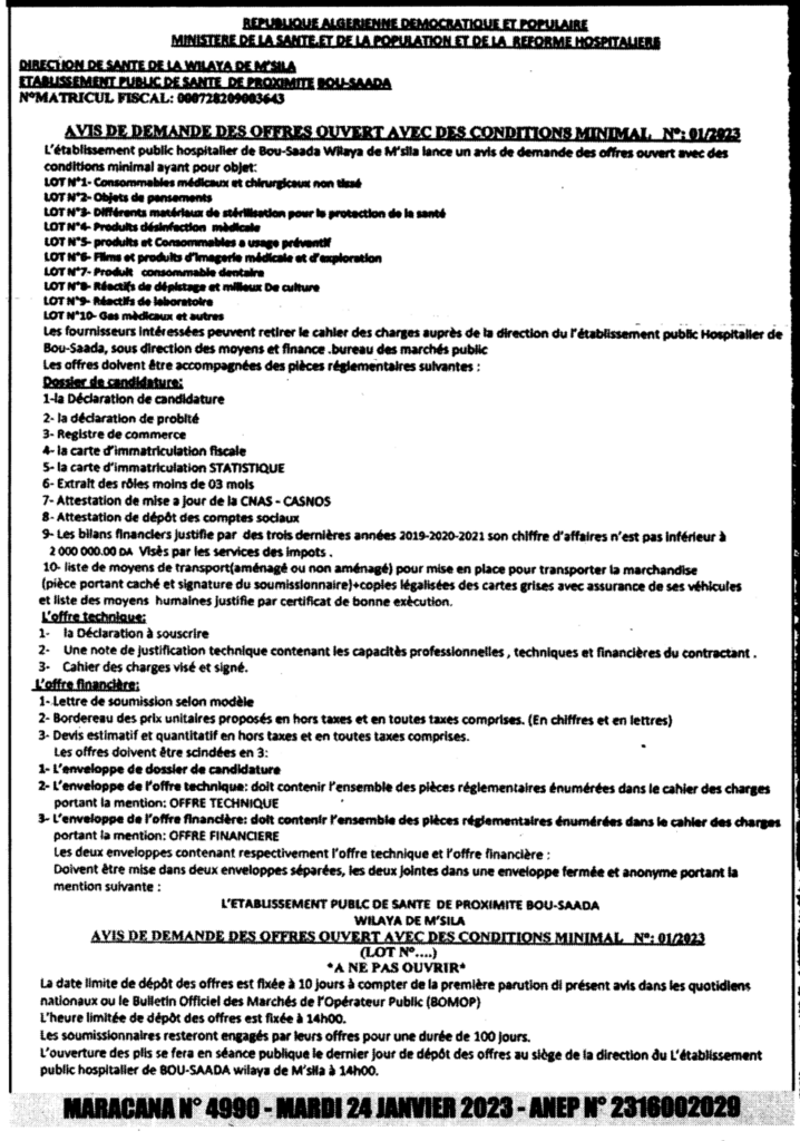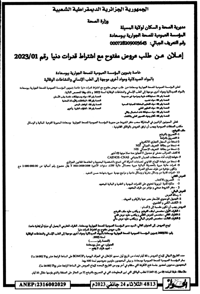 إعلان عن طلب عروض مفتوح 2023/01 قصد تموين المؤسسة العمومية للصحة الجوارية ببوسعادة بالمواد الصيدلانية ومواد أخرى موجهة إلى الطب الإنساني والنشاطات الوقائية