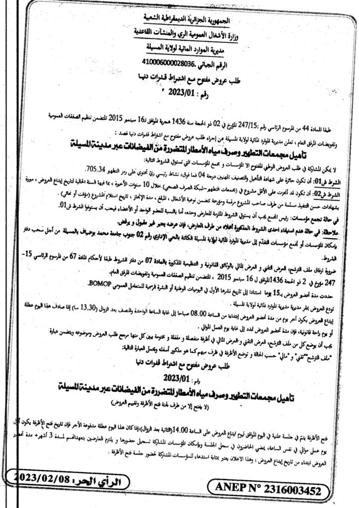 طلب عروض مفتوح مع اشتراط قدرات دنيا قصد: تأهيل مجمعات التطهي وصرف مياه الأمطار المتضررة من الفياضات عبر مدينة المسيلة8 فبراير، 20230 5 شاركها فيسبوك X مشاركة عبر البريد طباعة