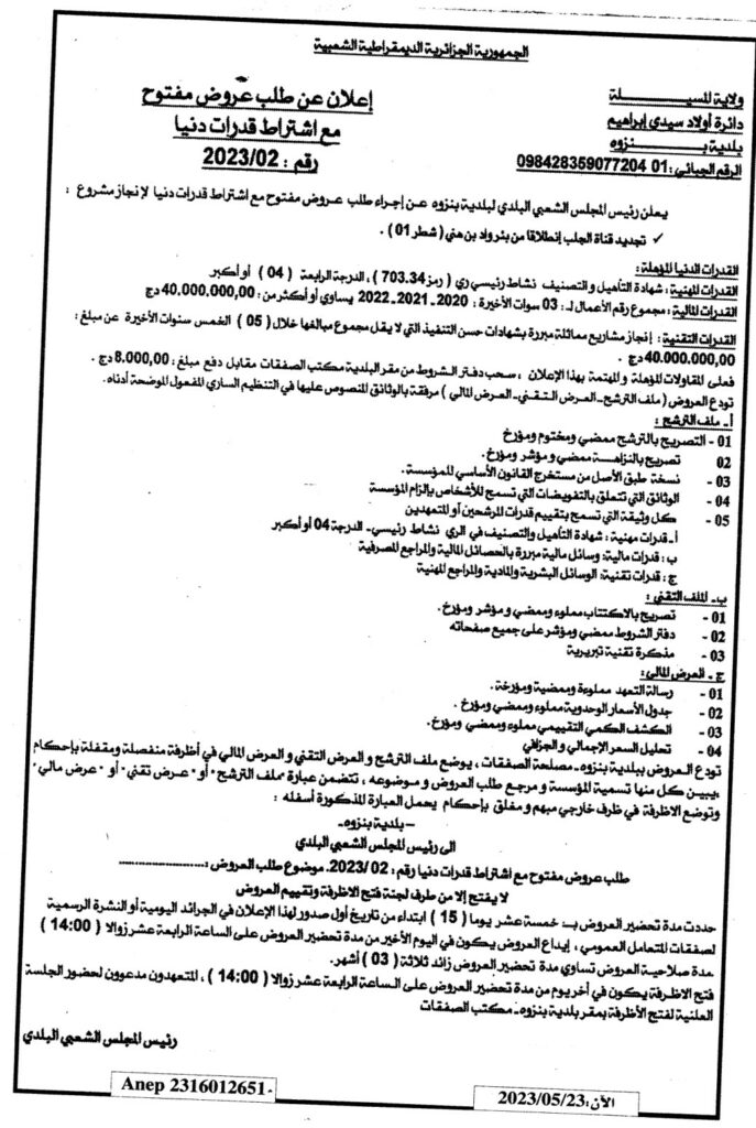 طلب عروض مفتوحرمع اشتراط قدرات دنيا لانجاز مشروع: تجديد قناة الجلب من بئر واد بن هني (شطر 01)23 مايو، 20230 17 شاركها فيسبوك X مشاركة عبر البريد طباعة