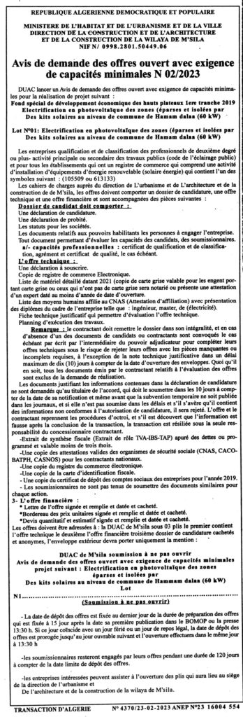 إعلان عن طلب عروض مفتوح 2023/02 مديرية التعمير والهندسة المعمارية لولاية المسيلة