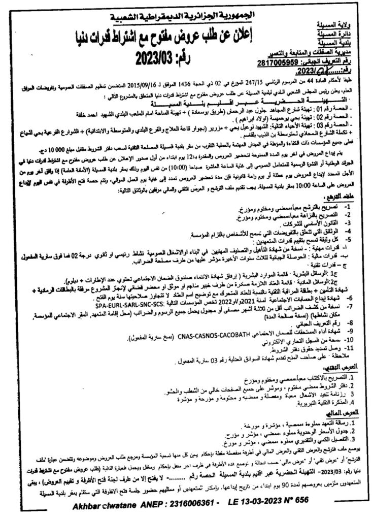 إعلان عن طلب عروض مفتوح 2023/03 بلدية المسيلة
