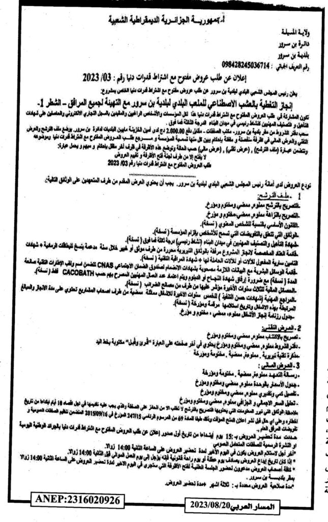 إعلان عن طلب عروض مفتوح 2023/03 بلدية بن سرور
